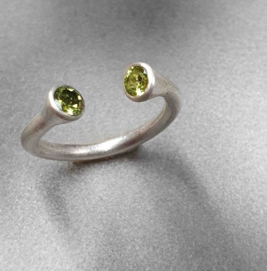 Silberring mit Olivinsteinen,210EuroCollier aus Silber,750Gold und synth.Smaragd,645EuroOhrstecker,195EuroKettenanhänger aus Silber an vergoldeter Kette mit Topas 275Euro